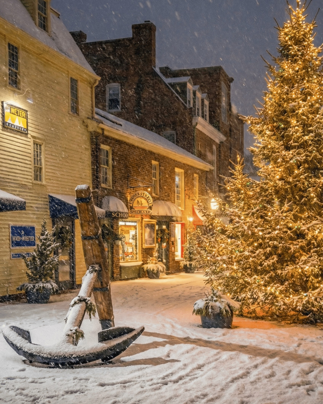 The large Christmas tree at Bowen’s Wharf remains one of Newport’s most recognizable winter photo backdrops throughout the holiday season. Set against historic wharf buildings, docked boats, and harbor lights, it delivers a classic coastal New England holiday aesthetic.
