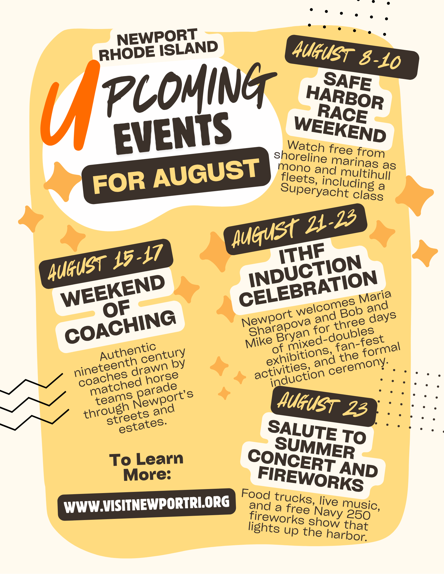 August fills Newport’s shoreline and historic grounds with sails, markets, music, and open-air classes. The paragraphs below cover every event supplied in our listings. Where an experience repeats, you will see one description followed by its additional dates. Each title links to the original event page so you can confirm times and reserve tickets.