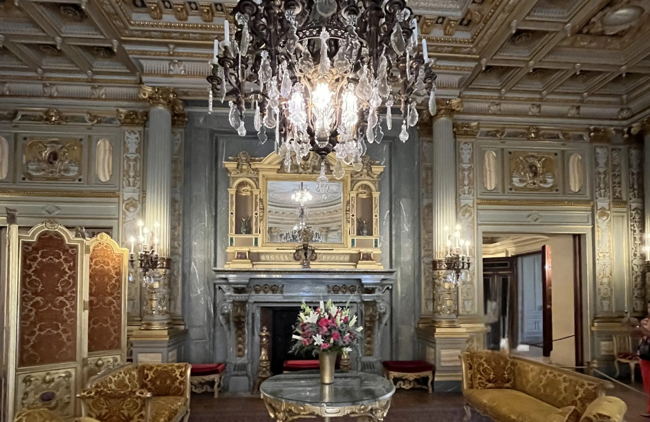 Facing east, the family sitting room was designed to catch first light on eight platinum-leaf reliefs of the Muses—platinum chosen because Atlantic salt air can’t tarnish it. Eight relief panels portray eight of the nine Muses; conservators first assumed they were silver, but portable X-ray fluorescence revealed pure platinum that never tarnishes.