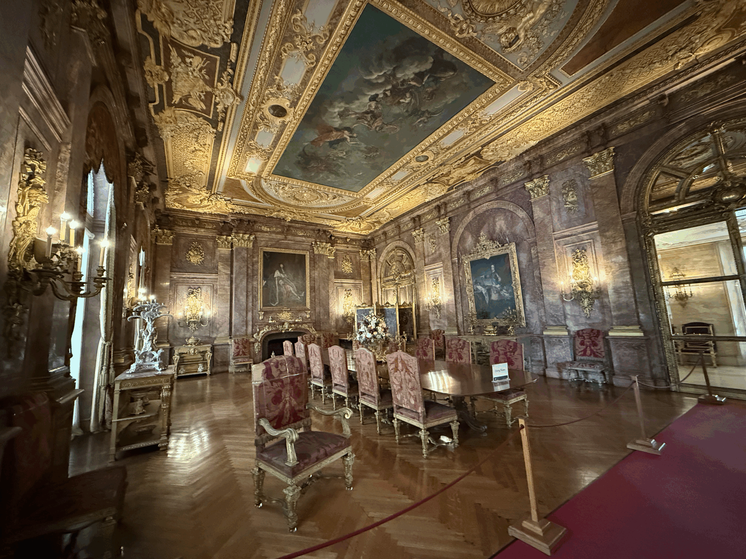 The Dining Room is a vision in pink Numidian marble from Algeria, with gilt bronze capitals and trophies punctuating the design. The fireplace reproduces the mantel in the Salon d’Hercule at Versailles, and an eighteenth century French ceiling painting elevates the classical grandeur of the room. Reports that the heavy Louis XIV style chairs required footmen to assist guests are anecdotal, so treat that detail as unconfirmed unless cited by a primary source.